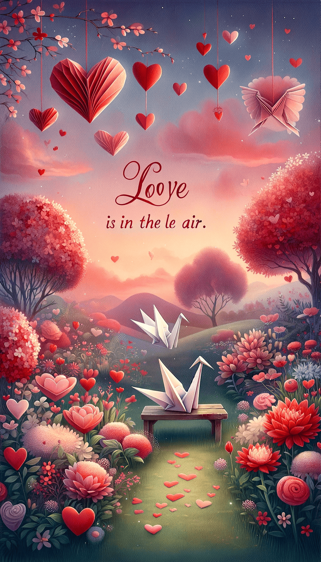 A Valentine's Day postcard design featuring a whimsical garden with heart-shaped flowers