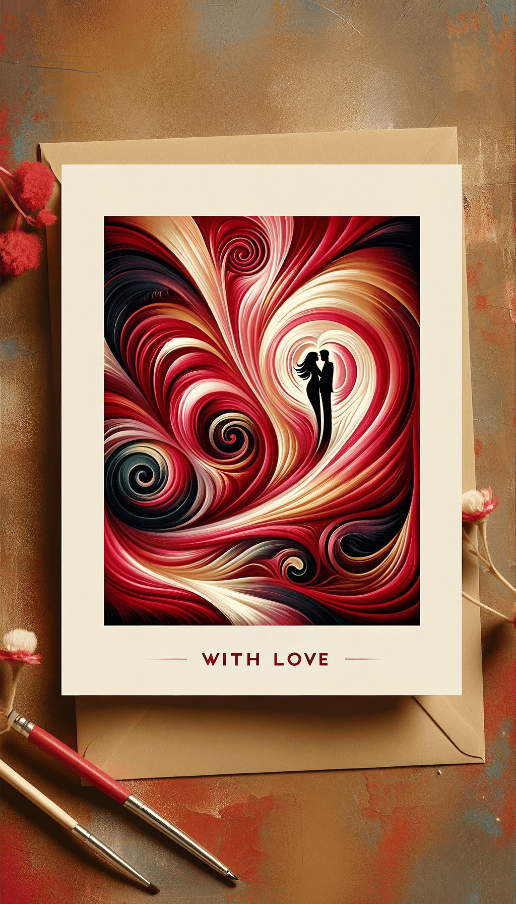 swirling colors in shades of red, pink, and gold, with silhouettes of a couple in a