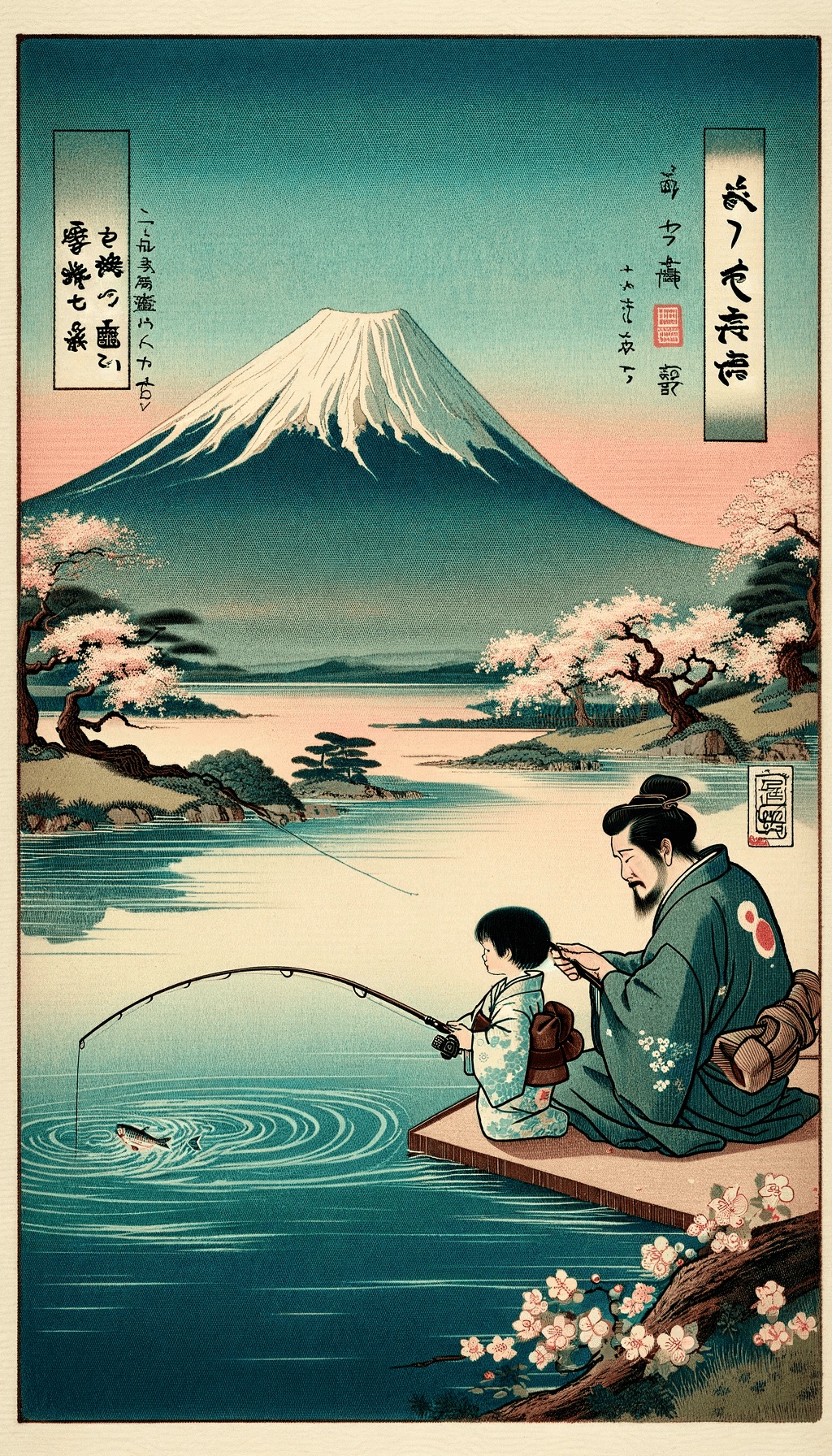 A Japanese ukiyo-e style postcard depicting a father teaching his child to fish,