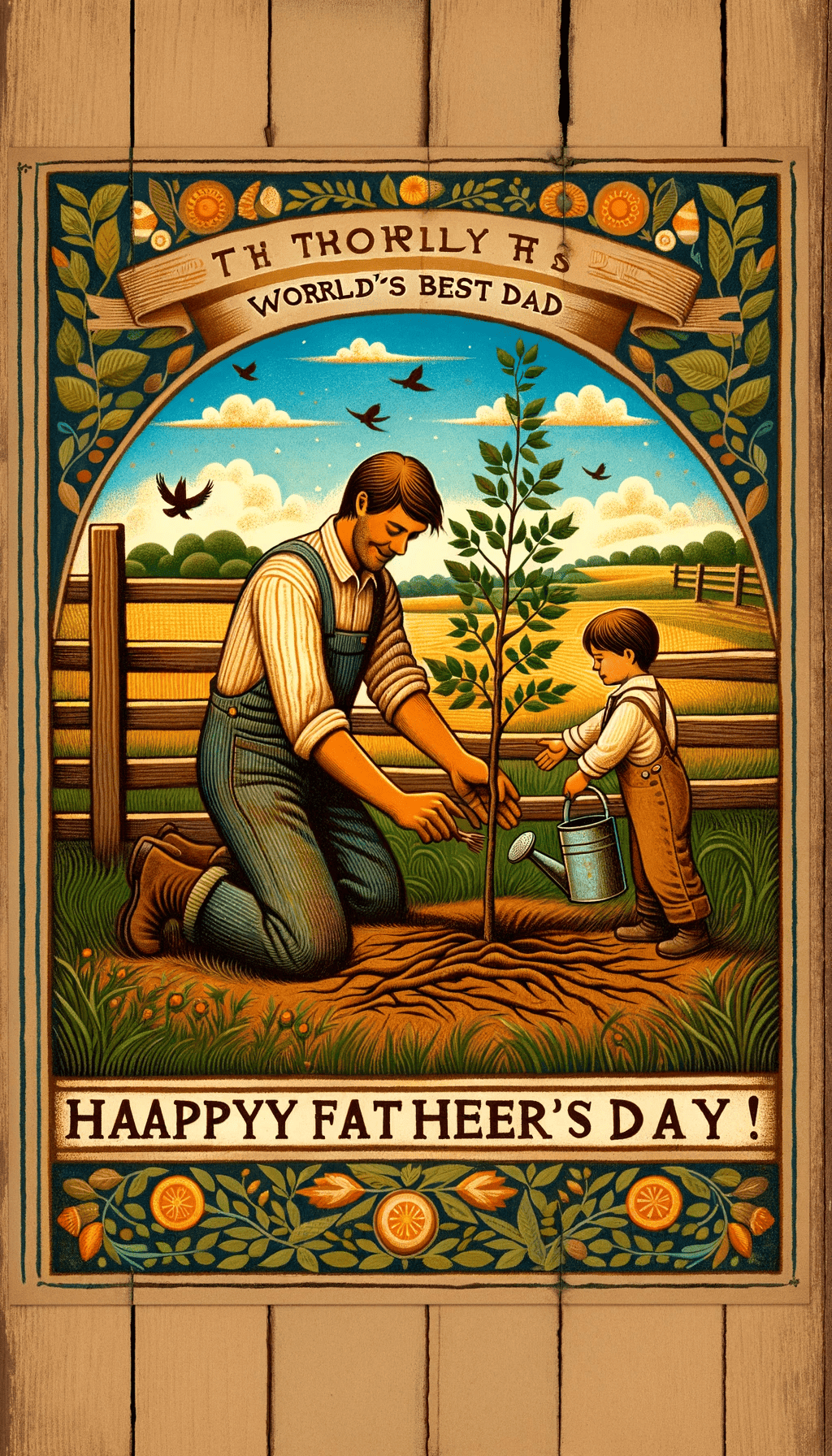 A beautiful, rustic, folk art style Father's Day postcard showing a father and child planting a tree.