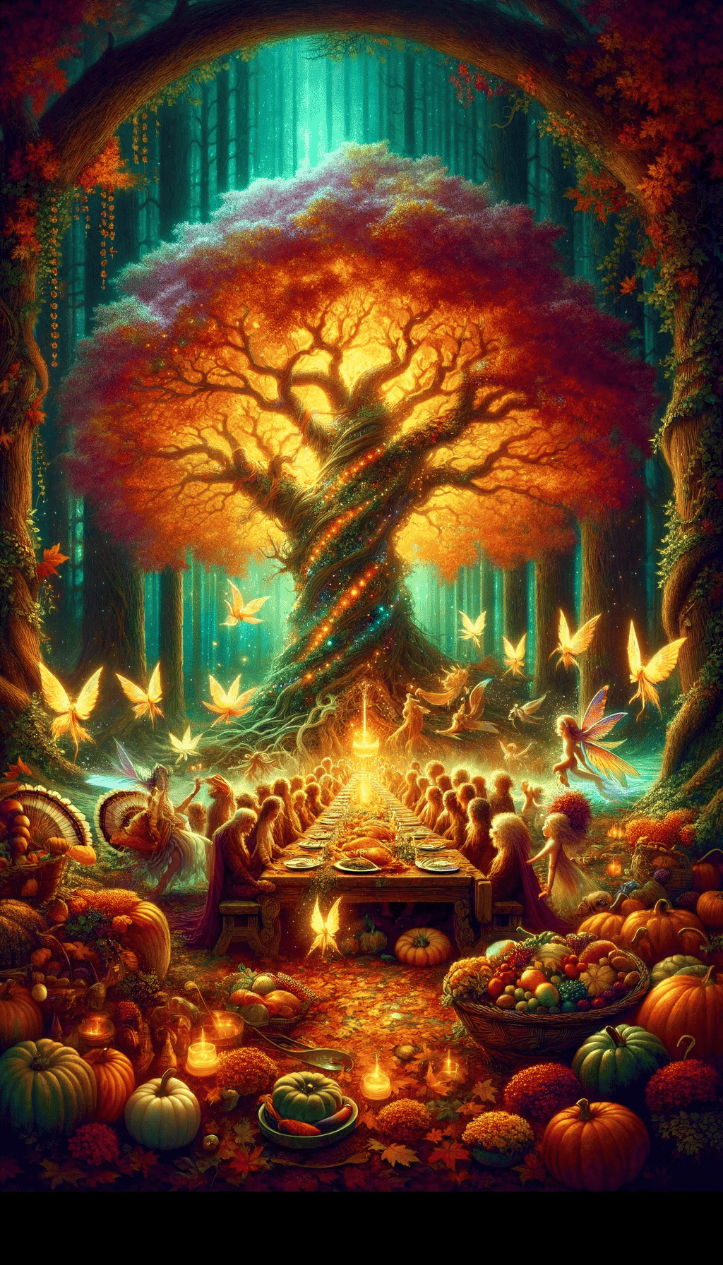 A postcard design featuring an autumnal equinox celebration with strong Thanksgiving themes, in a mystical, fantasy art style.