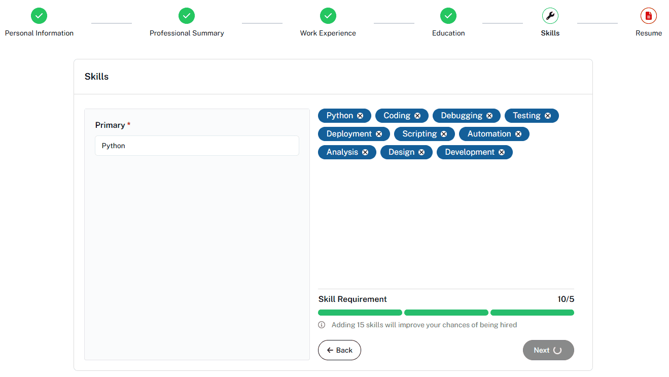 Finally, you input your relevant skills — technical, soft, or a mix of both. The tool organizes them into neat sections, ensuring they’re keyword-friendly for ATS (Applicant Tracking Systems).