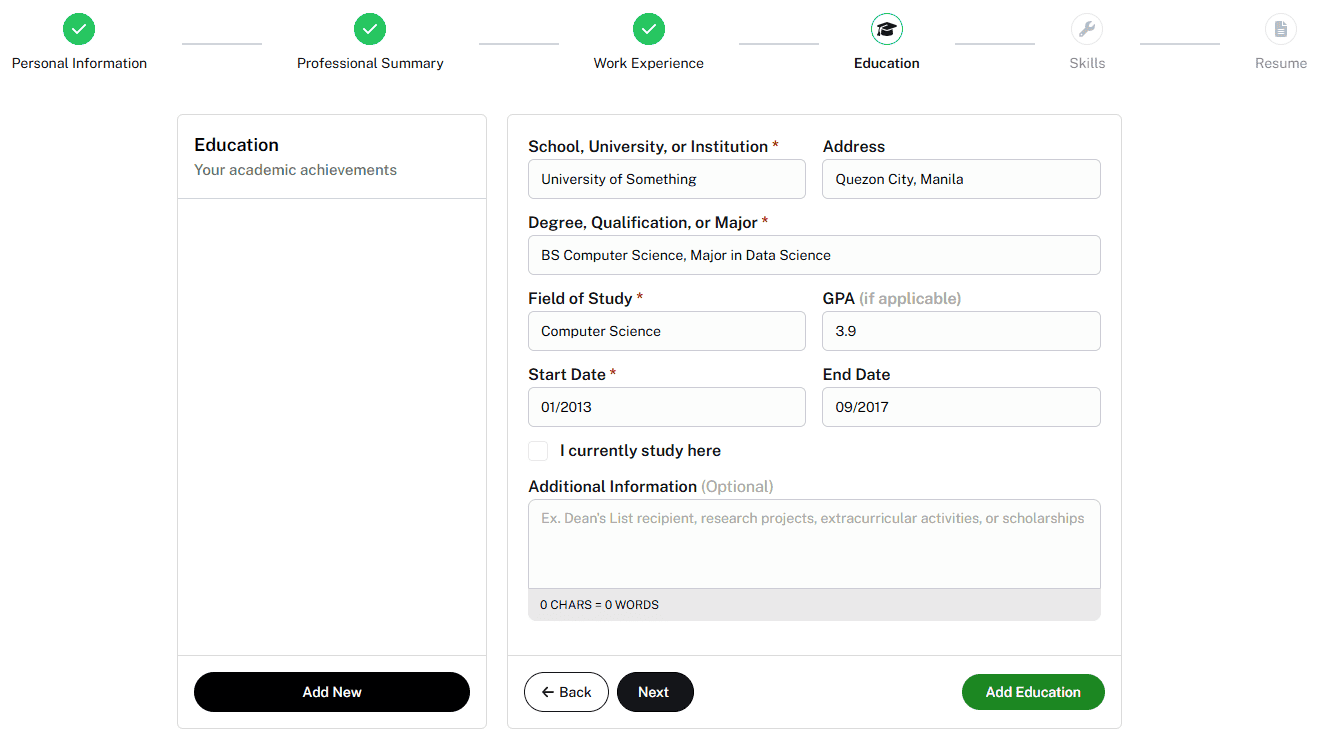 Straightforward — degrees, schools, years attended. Again, the AI handles formatting so it doesn’t look like a wall of text.