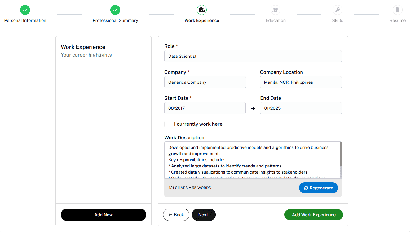 The idea is simple: you bring the raw details of your career, and the AI handles the structure, tone, and phrasing. The end result is a resume that feels professional, reads cleanly, and skips the fluff.