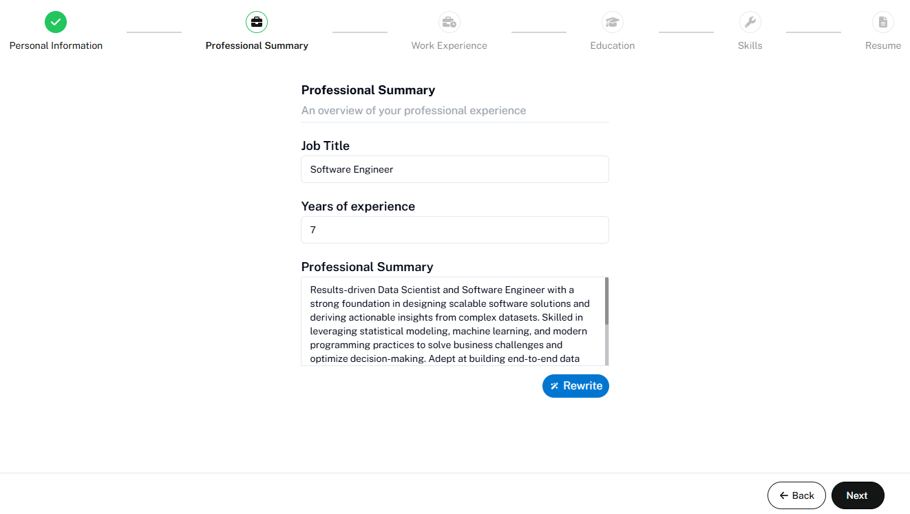 This is where most people get stuck. Writing about yourself in two or three sentences is hard. The Resume Builder prompts you to jot down who you are as a professional — then rewrites it into something sharper using the “Rewrite” option.