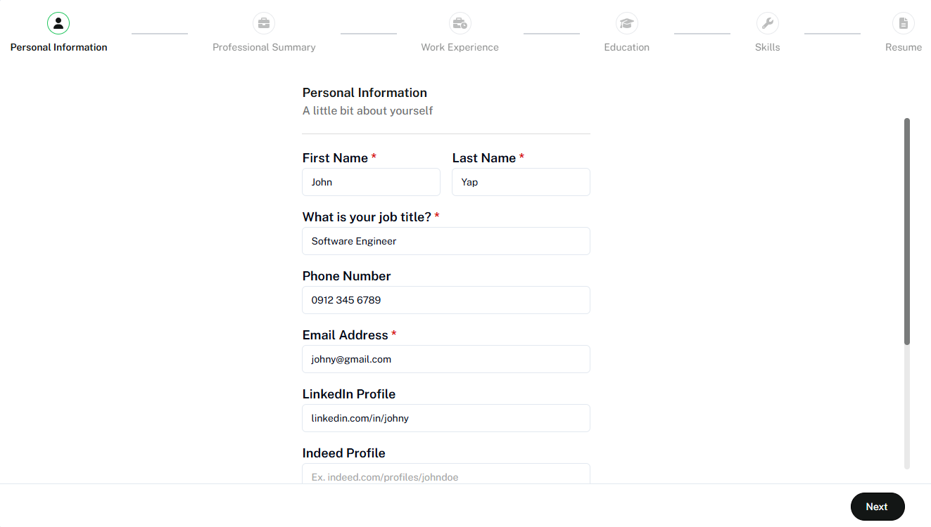Like the rest of Undetectable AI’s tools, the Resume Builder is straightforward. The process is broken into five inputs, and you just fill them out in order. Here’s how it flows: