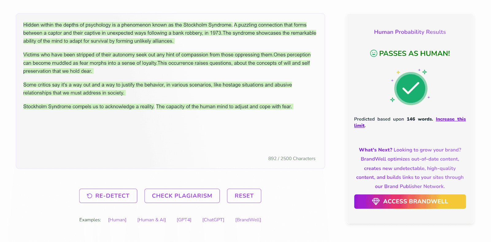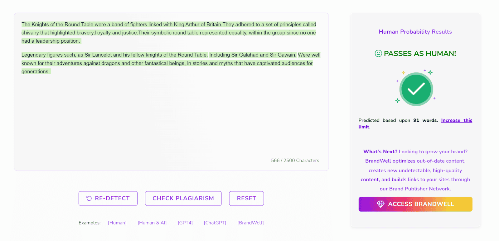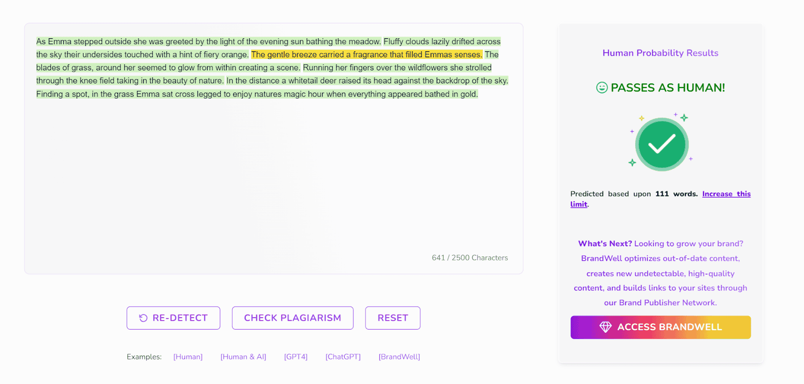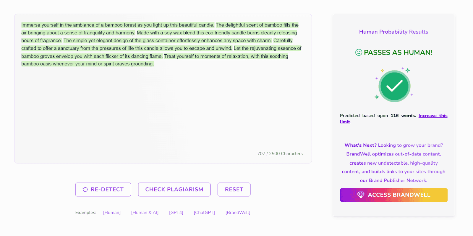 Well, that was worse than I thought. I really expected BrandWell to be stricter than this — after all, in our previous testing, it was one of the few who were able to sniff out traces of Undetectable AI in the text.
