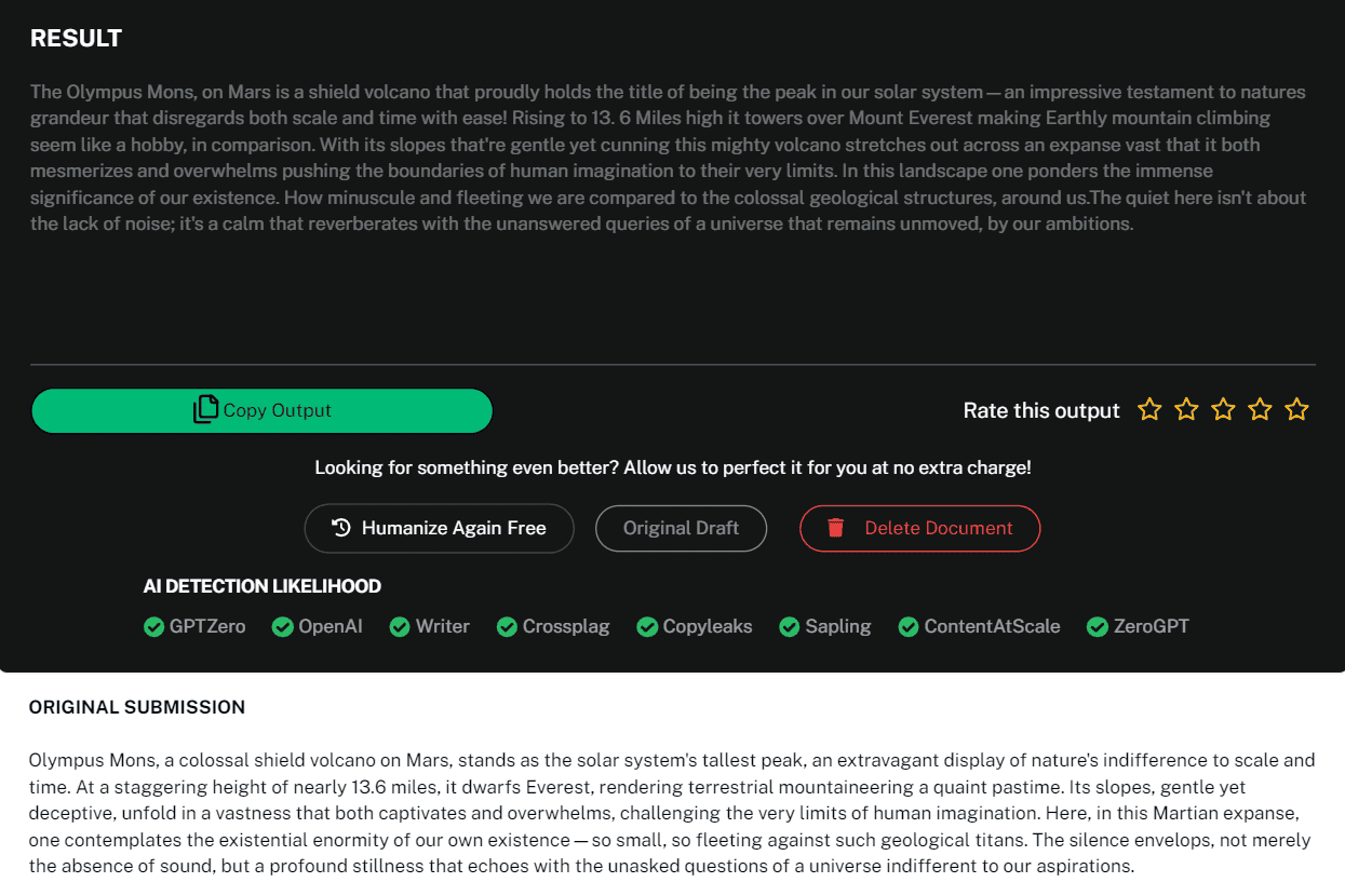 The second one is a little weird if you haven’t used any AI humanizers in the past. Undetectable AI adds a few intentional “human” errors to mask AI writing. This comes in the form of punctuation mistakes, grammar errors, and occasionally, misspelled words. Sure, it lowers the original AI likelihood score, but it also makes your output sometimes unreadable.