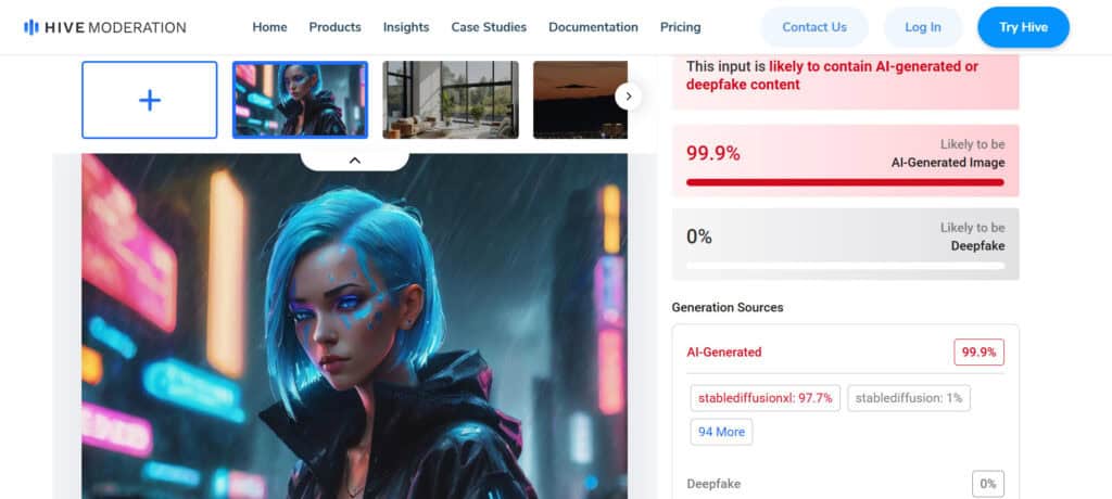 Hive A.I: Correctly flagged the generated image as AI