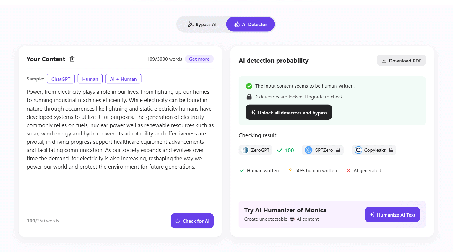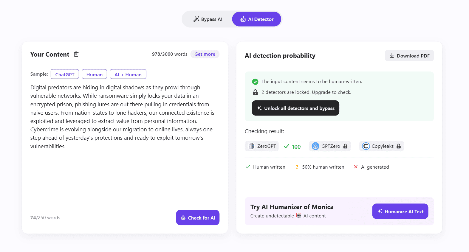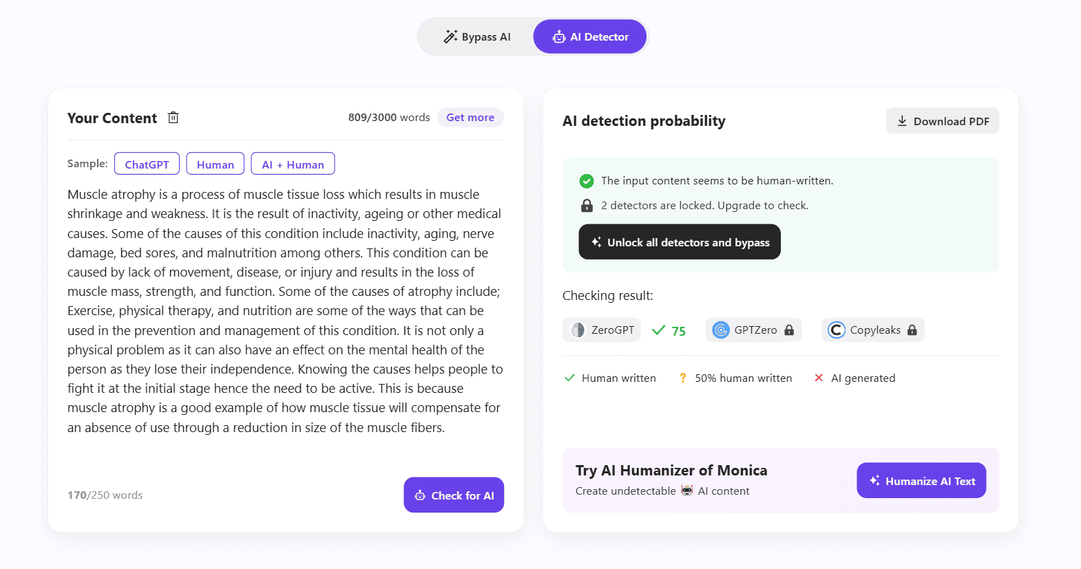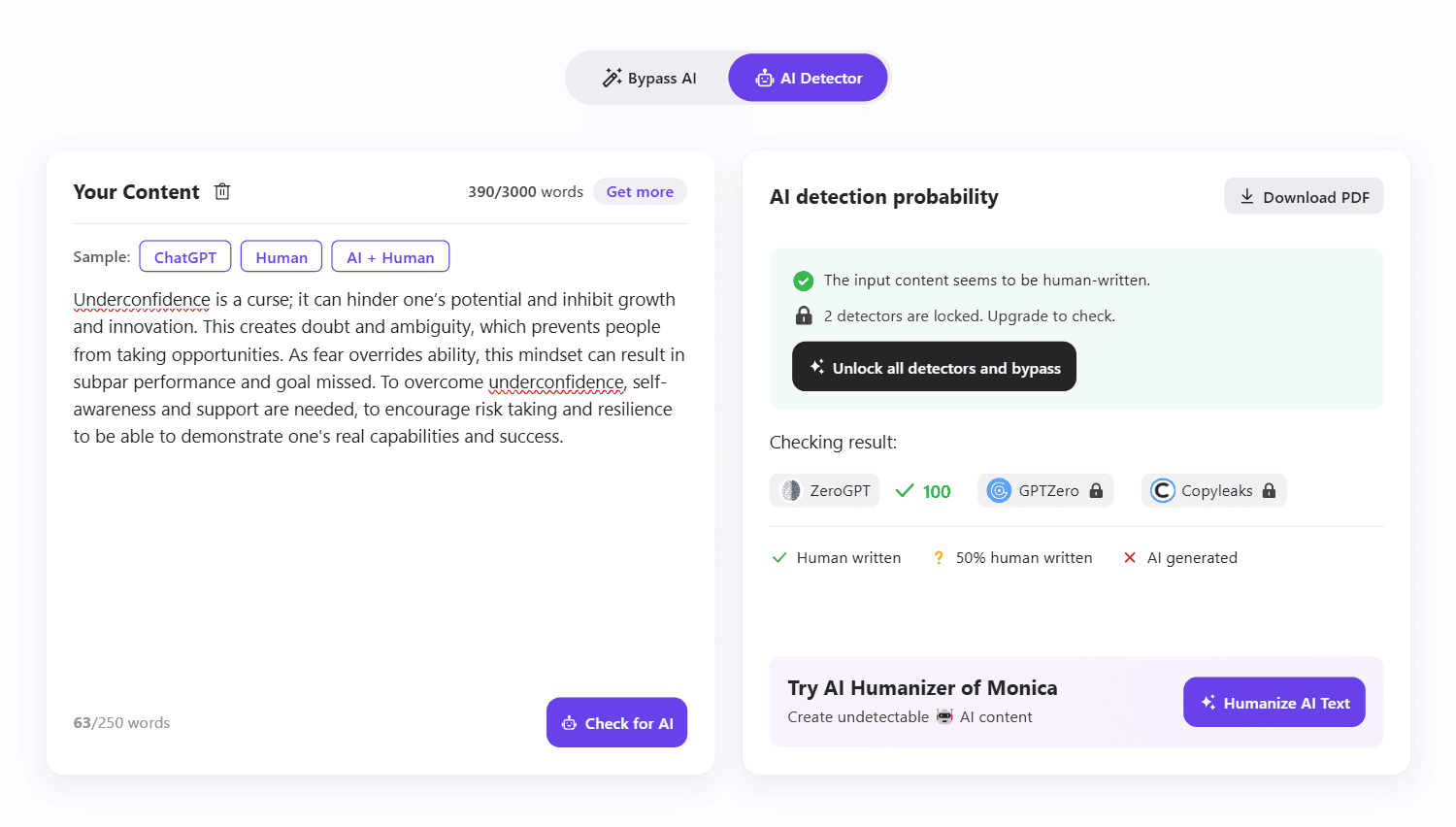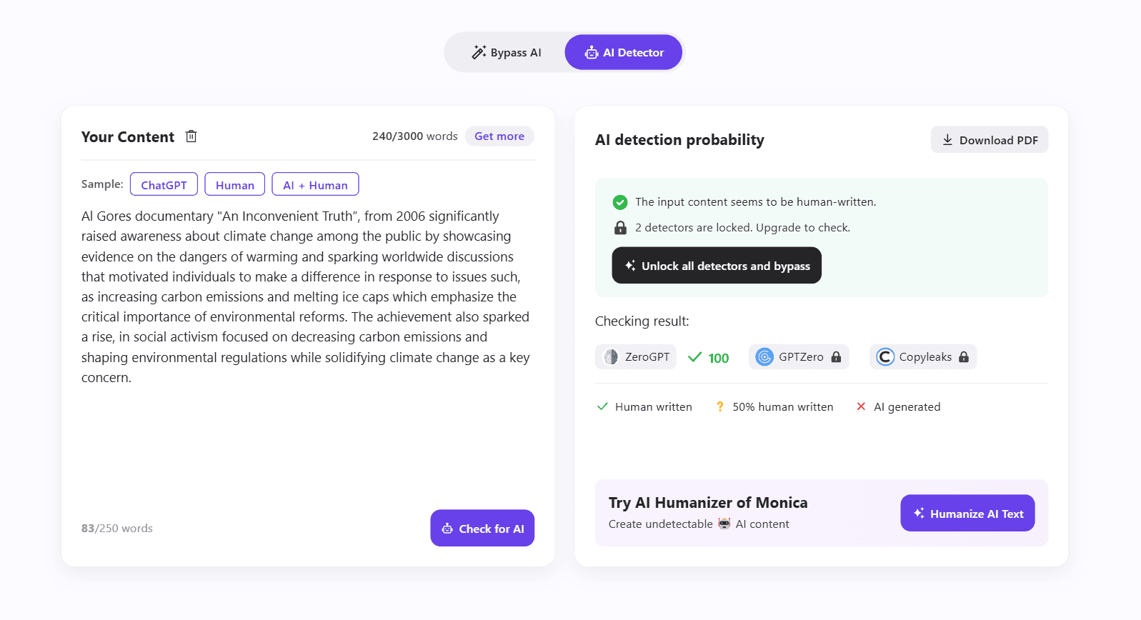 Because Monica’s AI detector is just three AI detectors wrapped in one: ZeroGPT, GPTZero, and Copyleaks. We’ve already tested Undetectable AI against them and it bested them each time. Why should this time be any different?