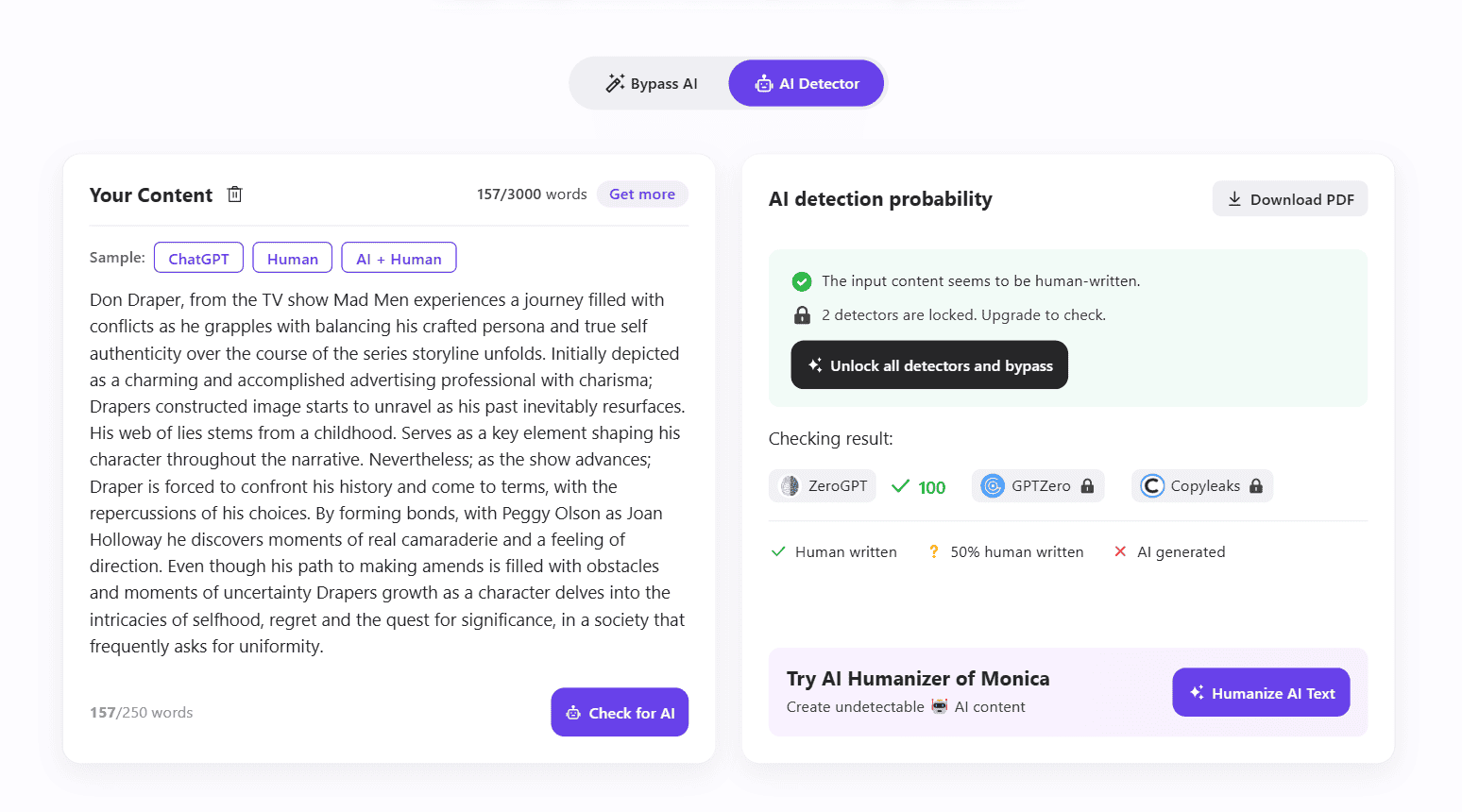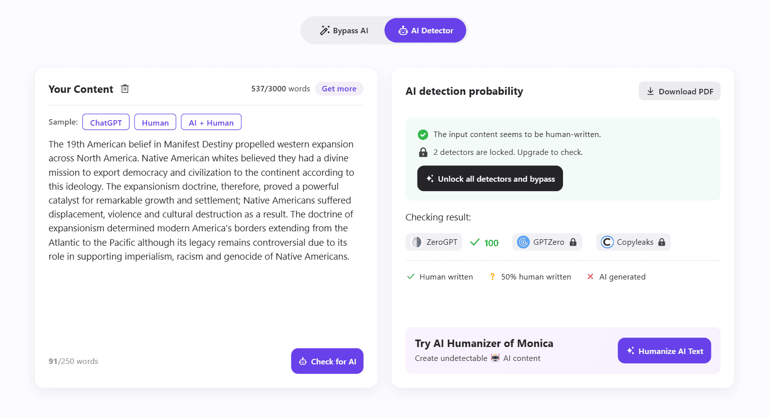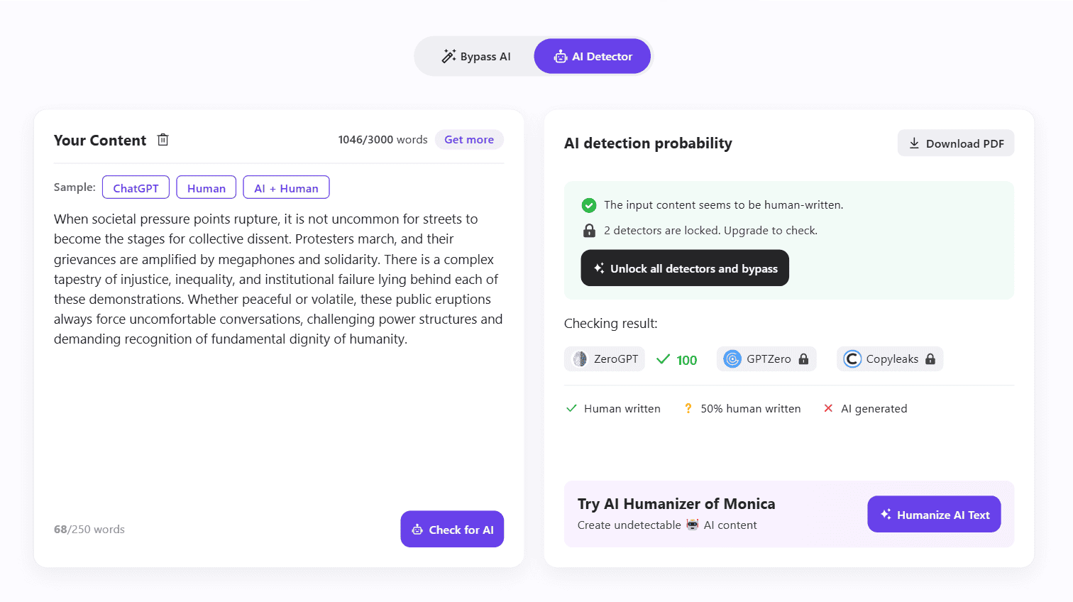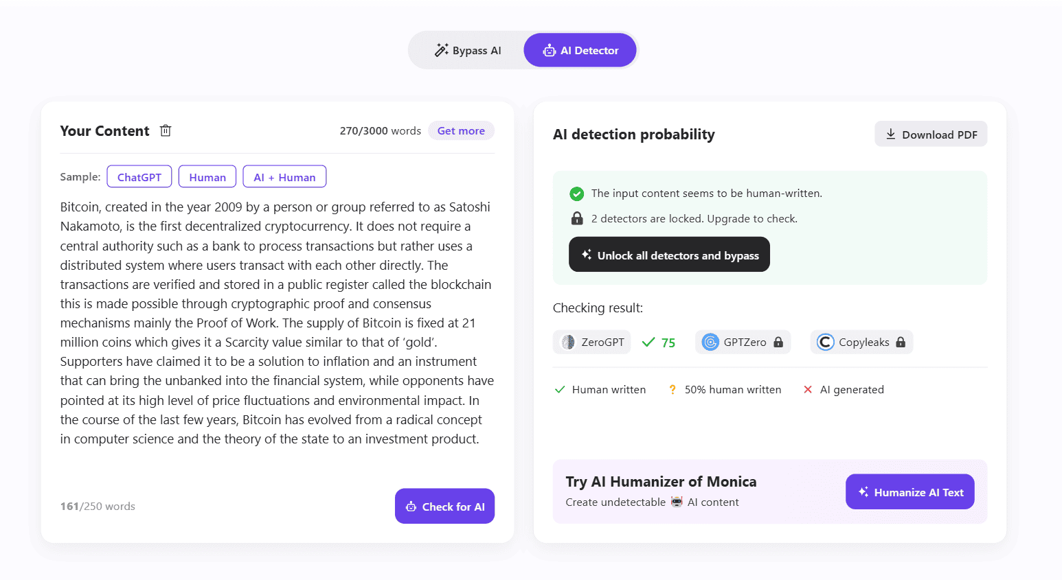 Because Monica’s AI detector is just three AI detectors wrapped in one: ZeroGPT, GPTZero, and Copyleaks. We’ve already tested Undetectable AI against them and it bested them each time. Why should this time be any different?