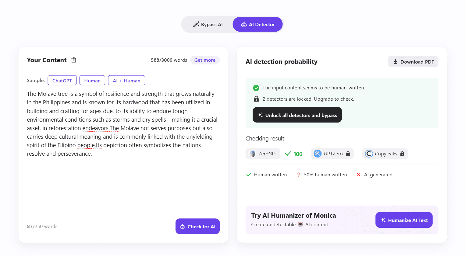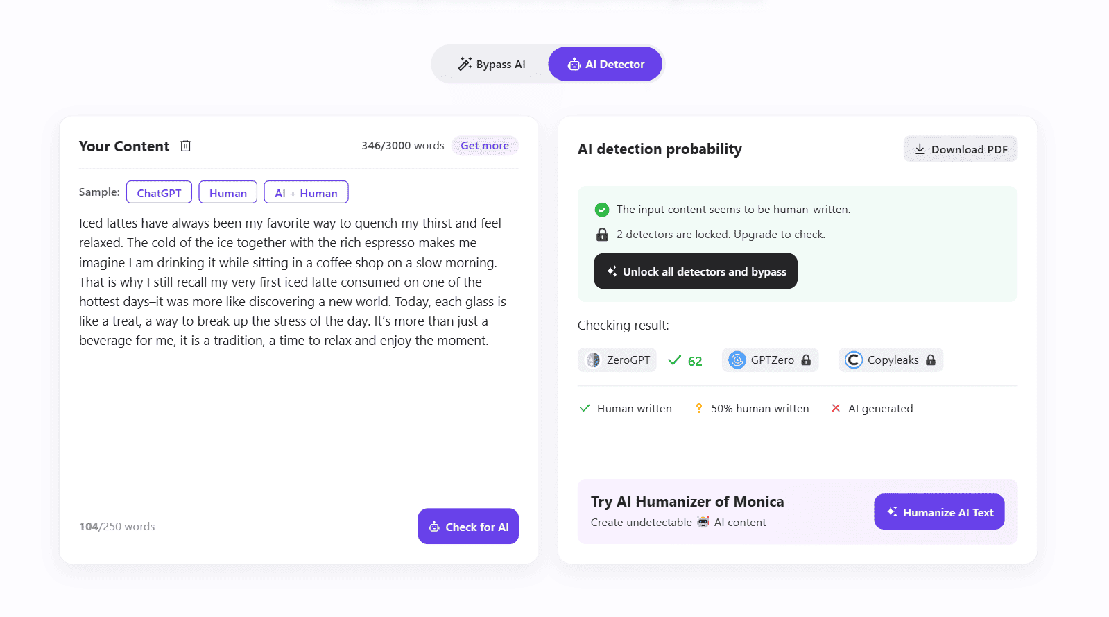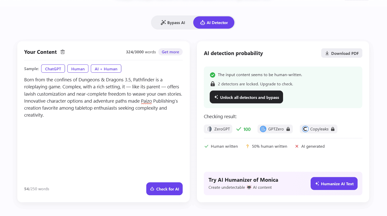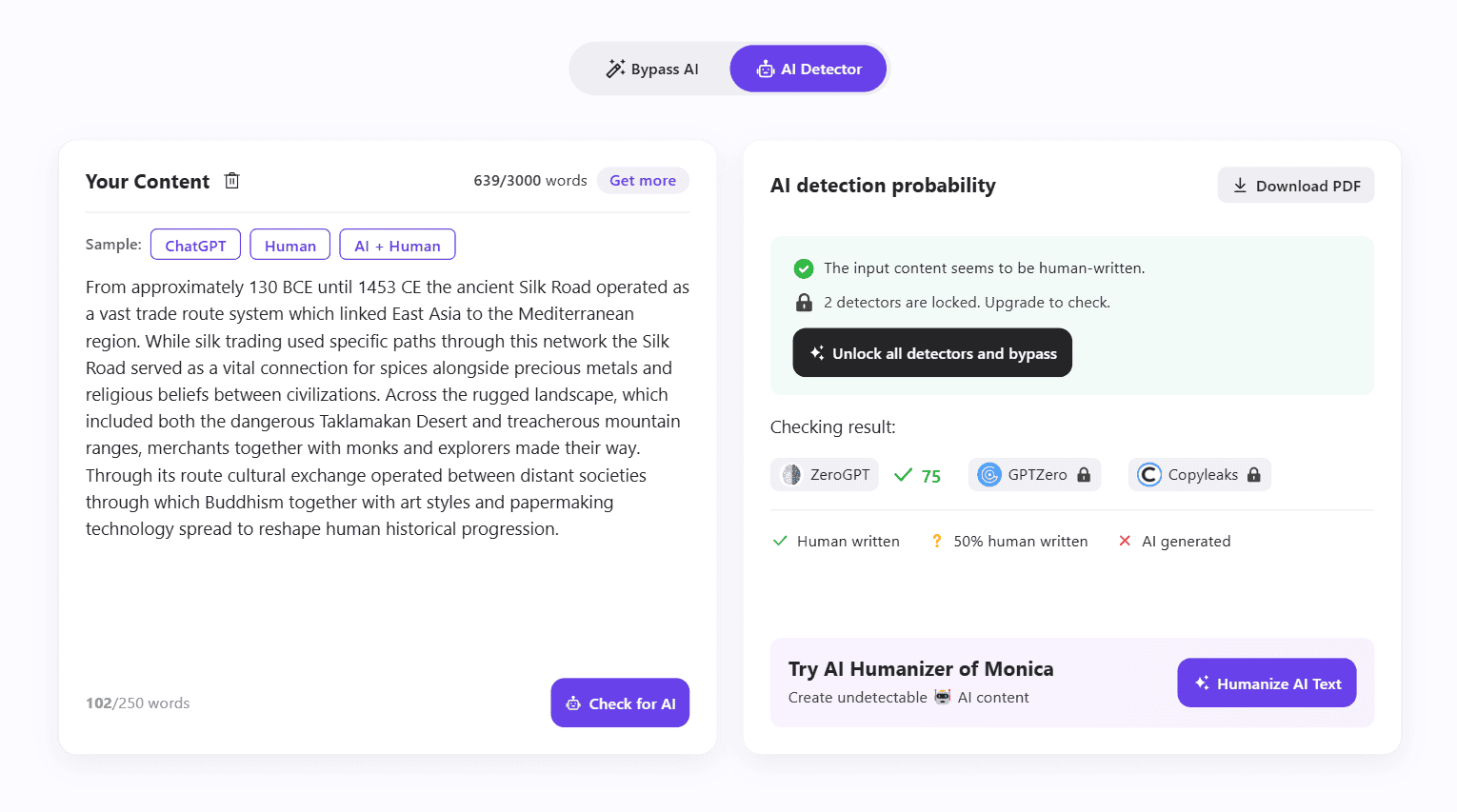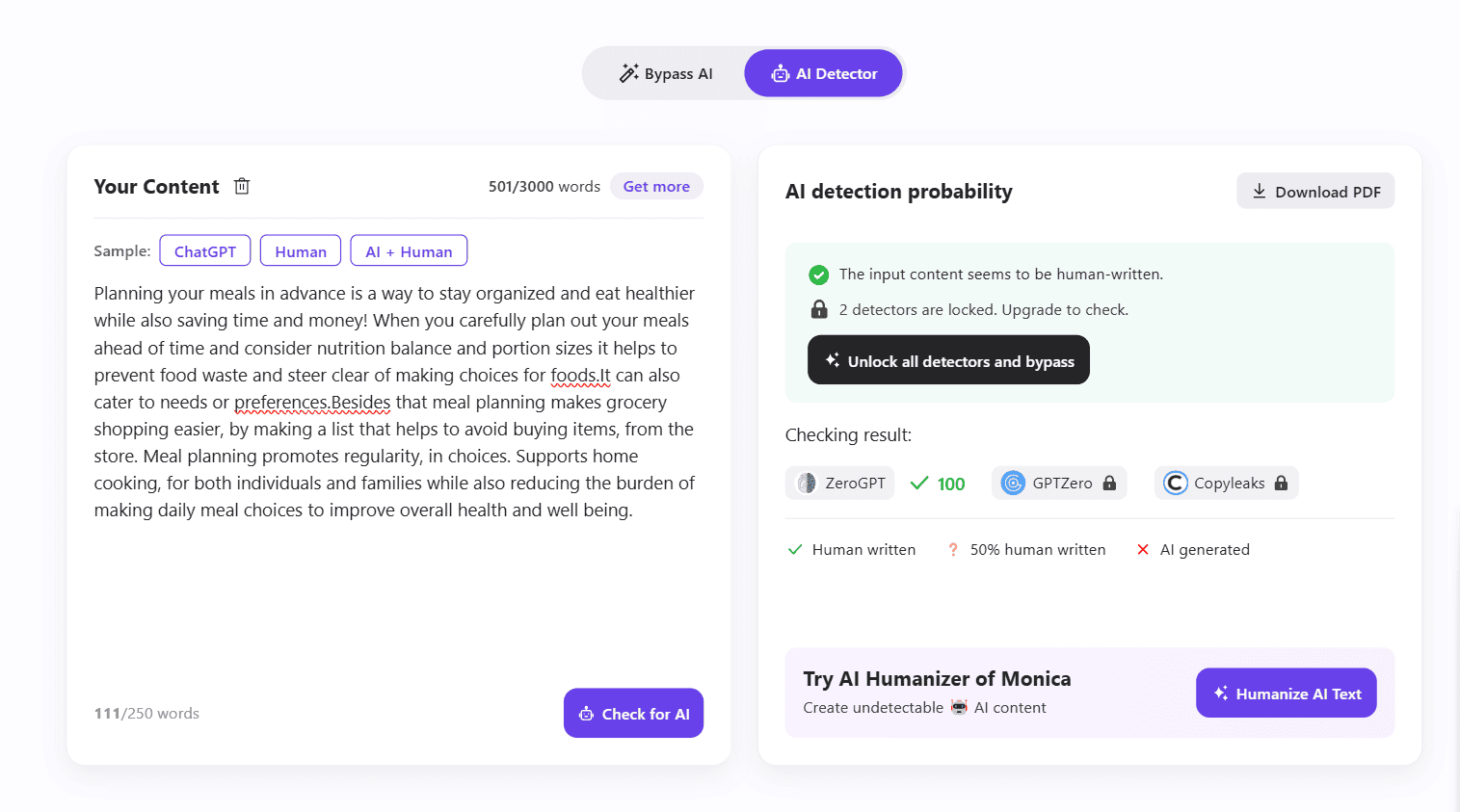 Because Monica’s AI detector is just three AI detectors wrapped in one: ZeroGPT, GPTZero, and Copyleaks. We’ve already tested Undetectable AI against them and it bested them each time. Why should this time be any different?