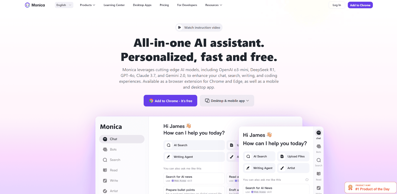 Monica solves this problem by bringing everything under one roof. It's an all-in-one AI assistant that leverages cutting-edge models including OpenAI o3-mini, DeepSeek R1, GPT-4o, Claude 3.7, and Gemini 2.0 to enhance your productivity.