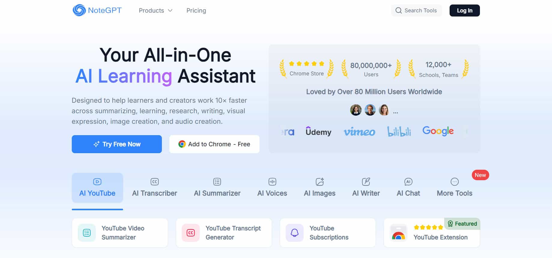 NoteGPT is a much broader platform than just a detector. It positions itself as an “AI learning assistant” with tools like summarizers, chat features, writing helpers, and more.