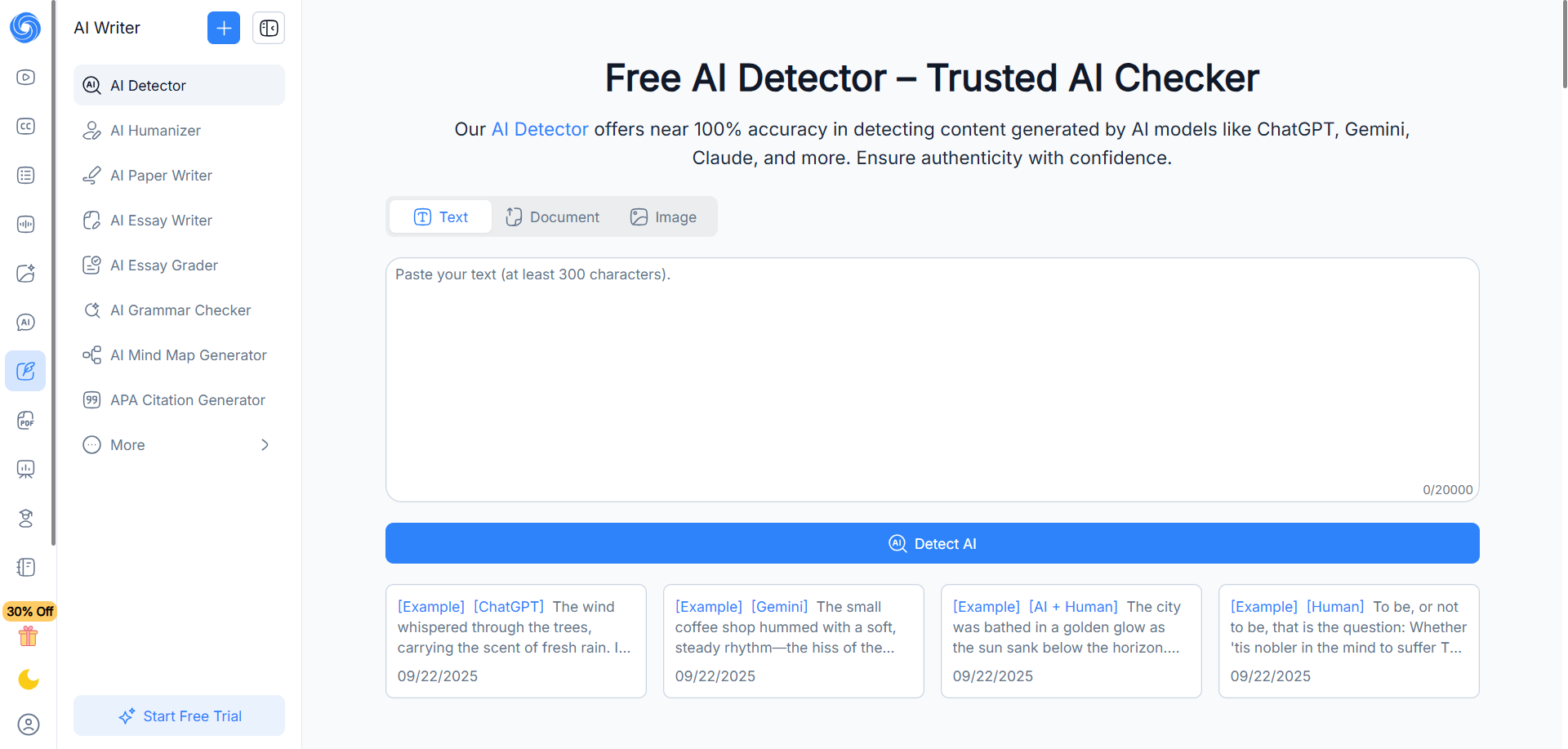 NoteGPT’s AI Detector is positioned as a free, no-login tool that checks whether content was AI-generated — and it explicitly mentions detecting writing from models like ChatGPT, Claude, and Gemini.