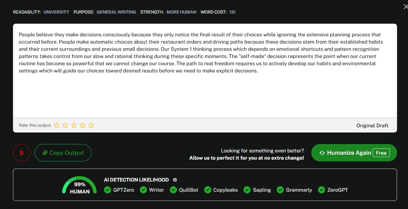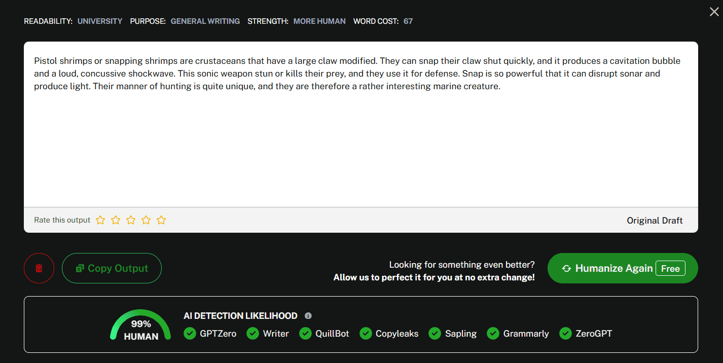 It’s not just about swapping synonyms. The good humanizers restructure sentence rhythm, vary phrasing, and remove the “too perfect” patterns that detectors tend to latch onto.