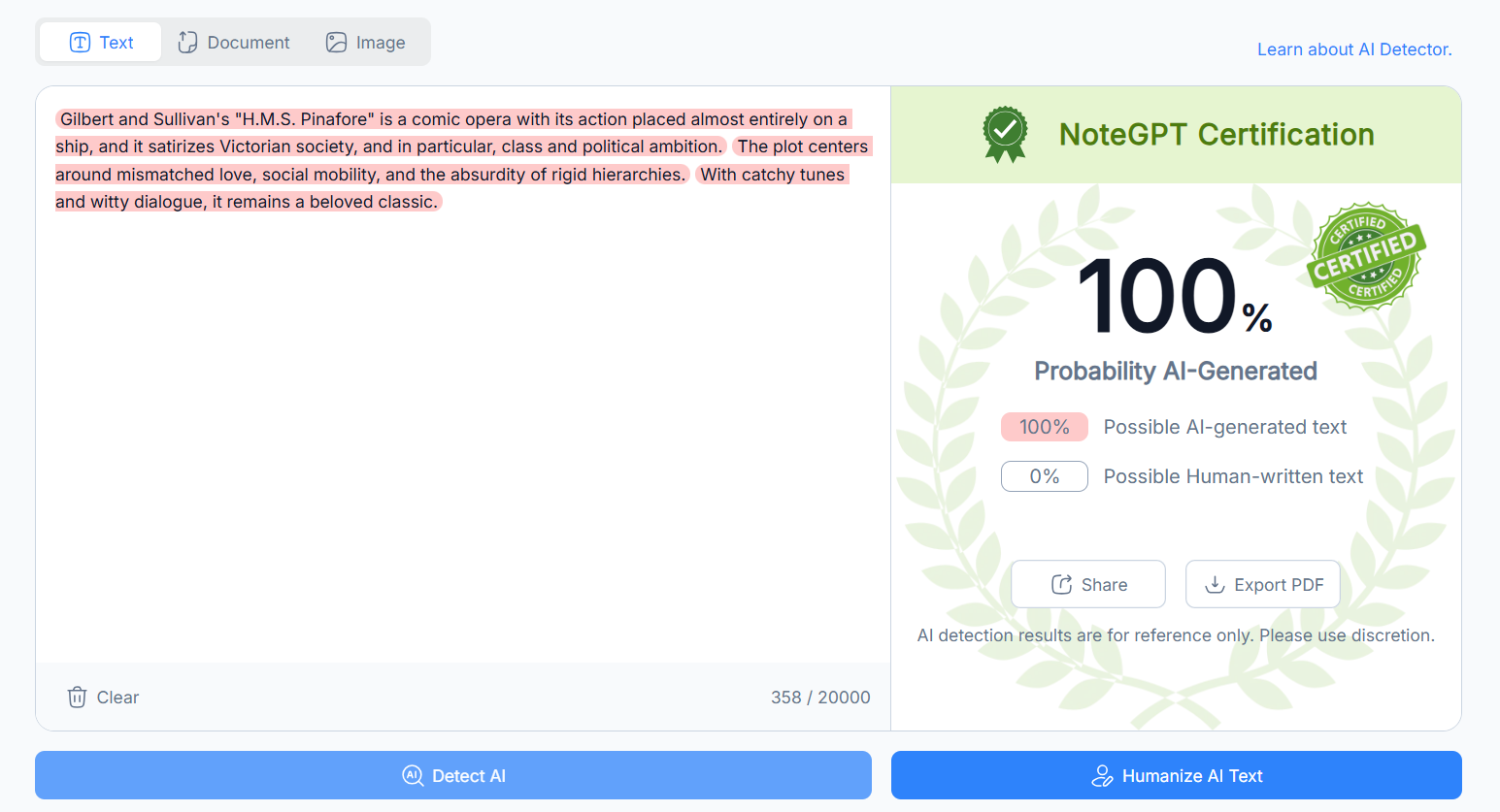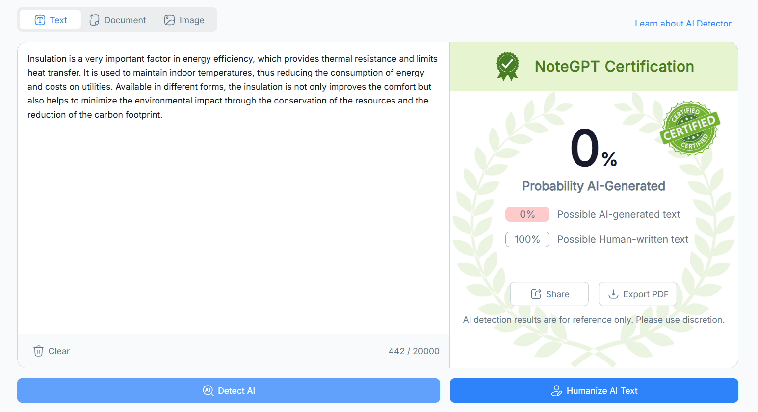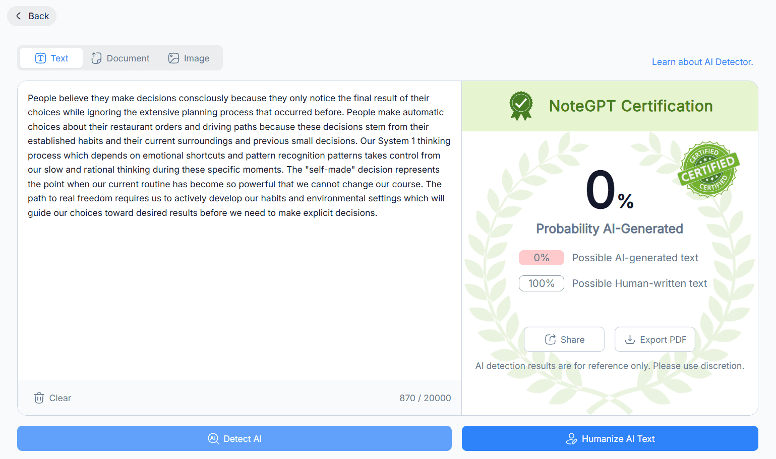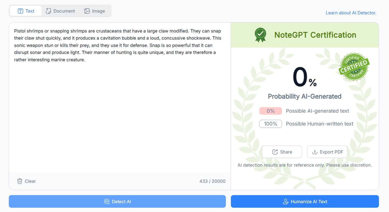 NoteGPT’s AI Detector has one big advantage: it’s convenient. It’s fast, easy to access, and it gives a quick probability-style verdict without much friction. For casual “gut check” scans, that simplicity is nice.