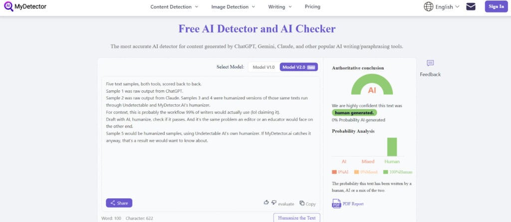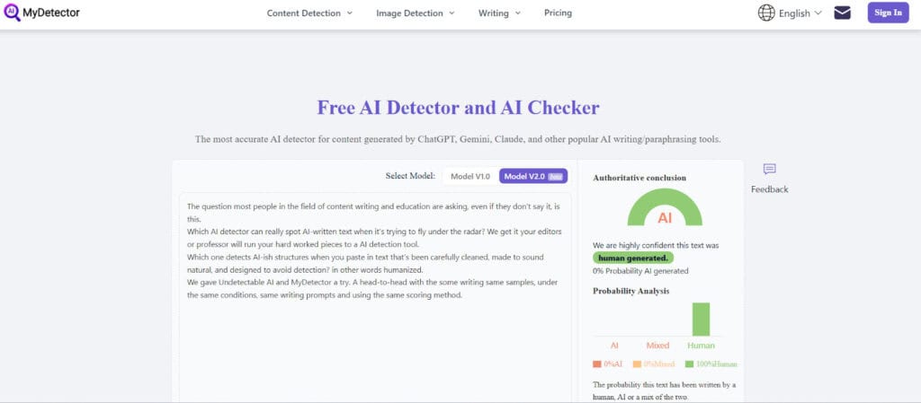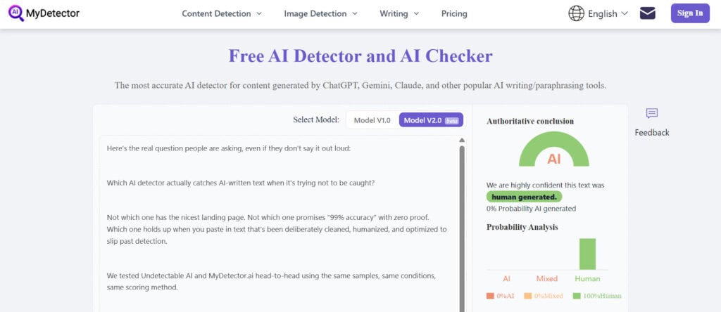 Verdict: MyDetector AI identified the text as AI as Human