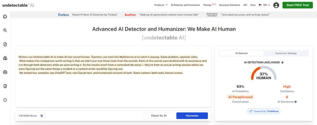 For a writer like me, that's a useful setup. Draft with AI, run it through the detector to see where you stand, humanize if needed, check again.