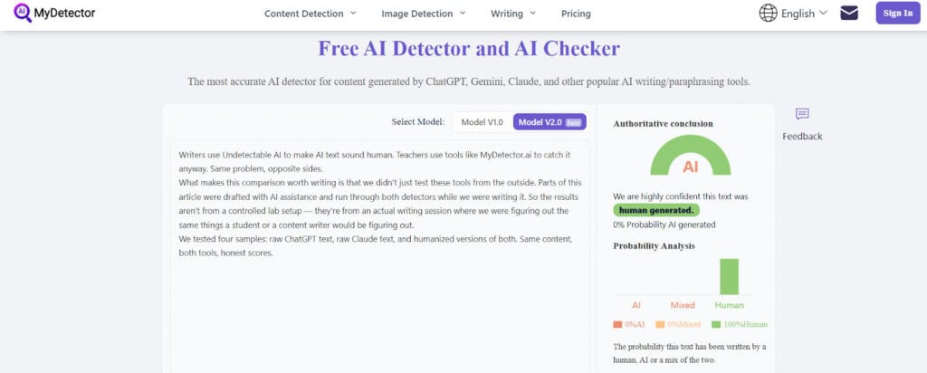 MyDetector.ai called everything human. Not just the rewritten samples, every single one, including raw ChatGPT and raw Claude text that hadn't been touched at all.