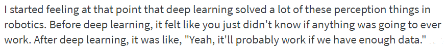 But when the team at OpenAI started entertaining the potential of AI and AGI (artificial general intelligence), Peter’s interest was rekindled. He saw this as an opportunity to focus on problem-solving rather than publishing. People were getting results with deep learning and deep reinforcement learning, so he turned his attention there. And he realized soon enough that this was a practical and promising answer to his robotics problem.