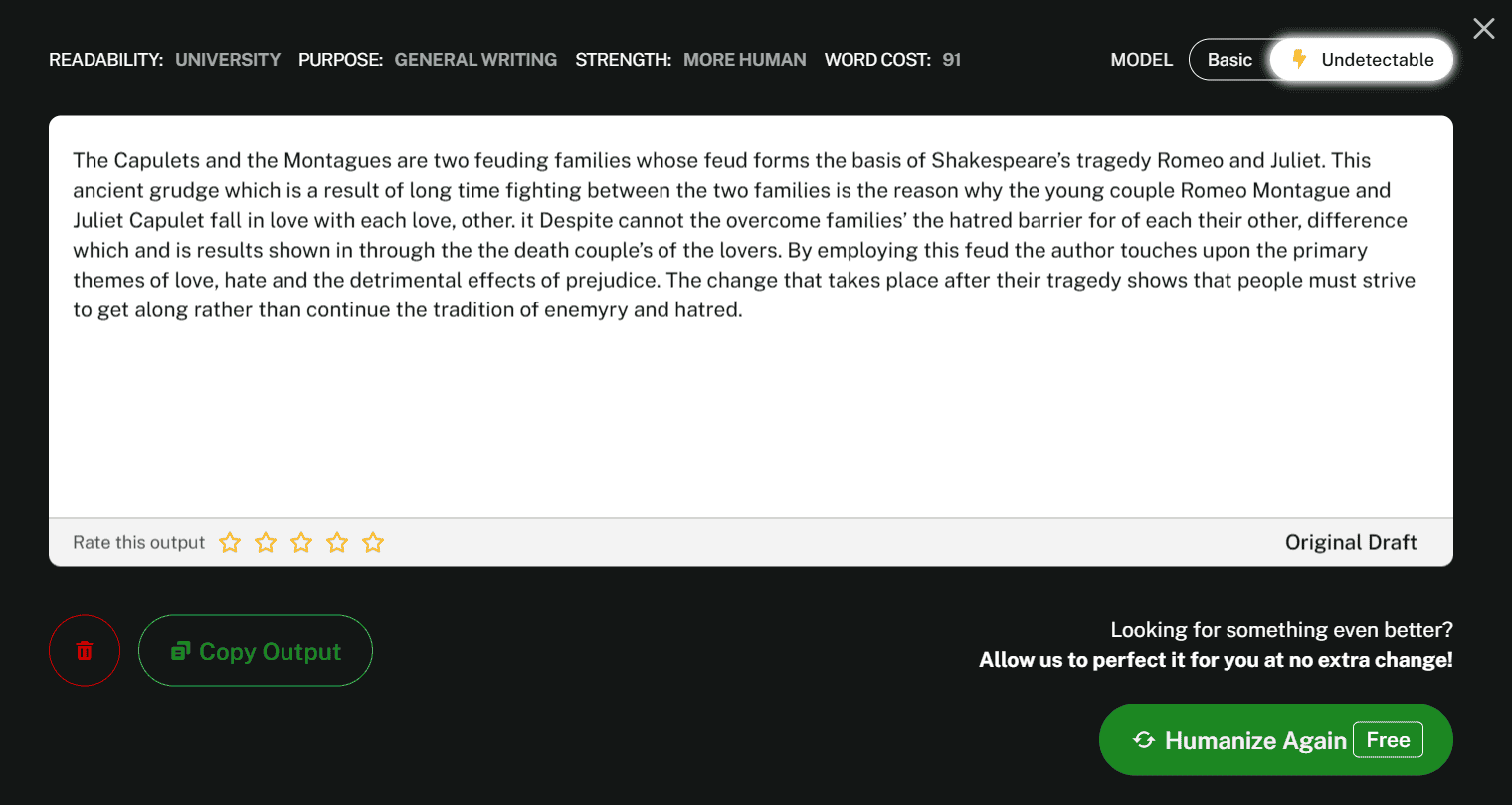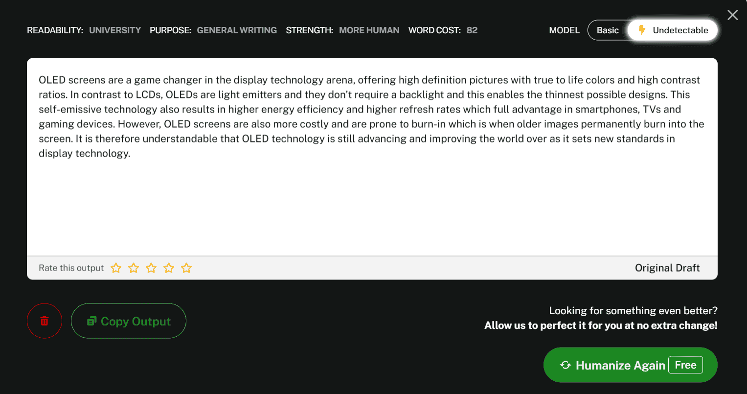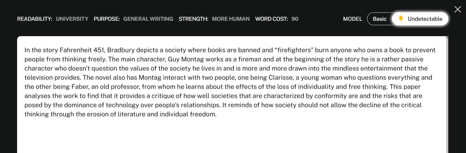 Undetectable AI is among the first AI bypassers in the market, and it’s the one that I trust most. They humanize text by removing common AI words, changing sentence structure, and adding a few intentional errors. You can read more about them in our complete review of the platform.