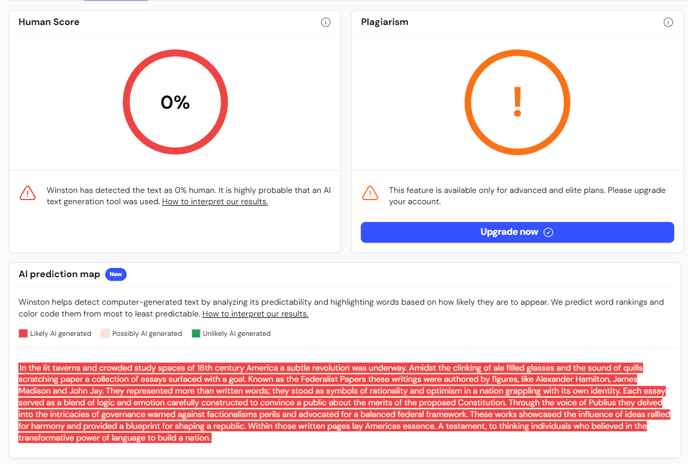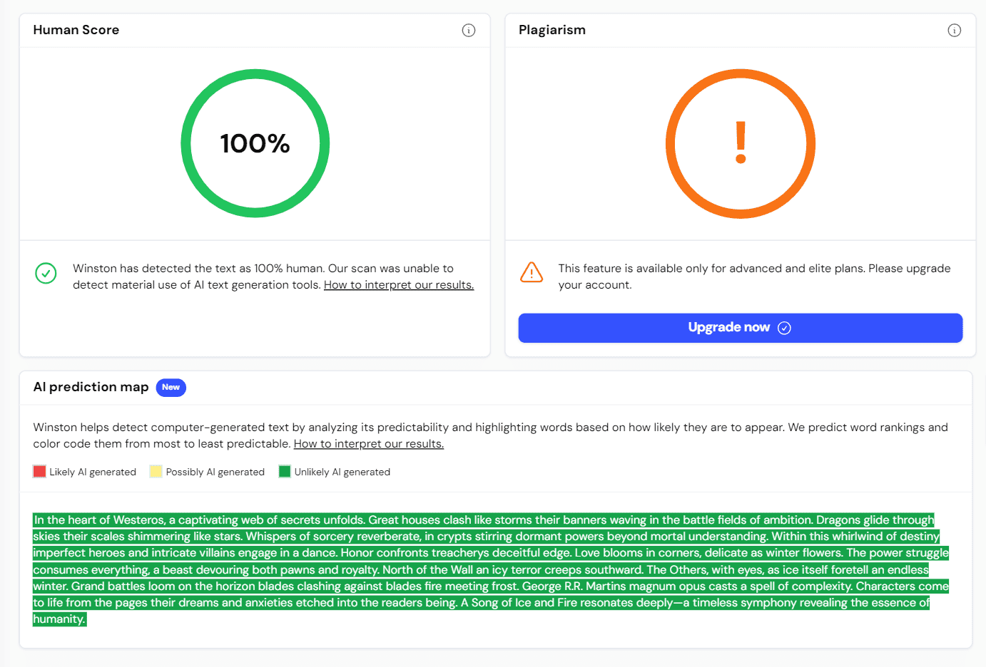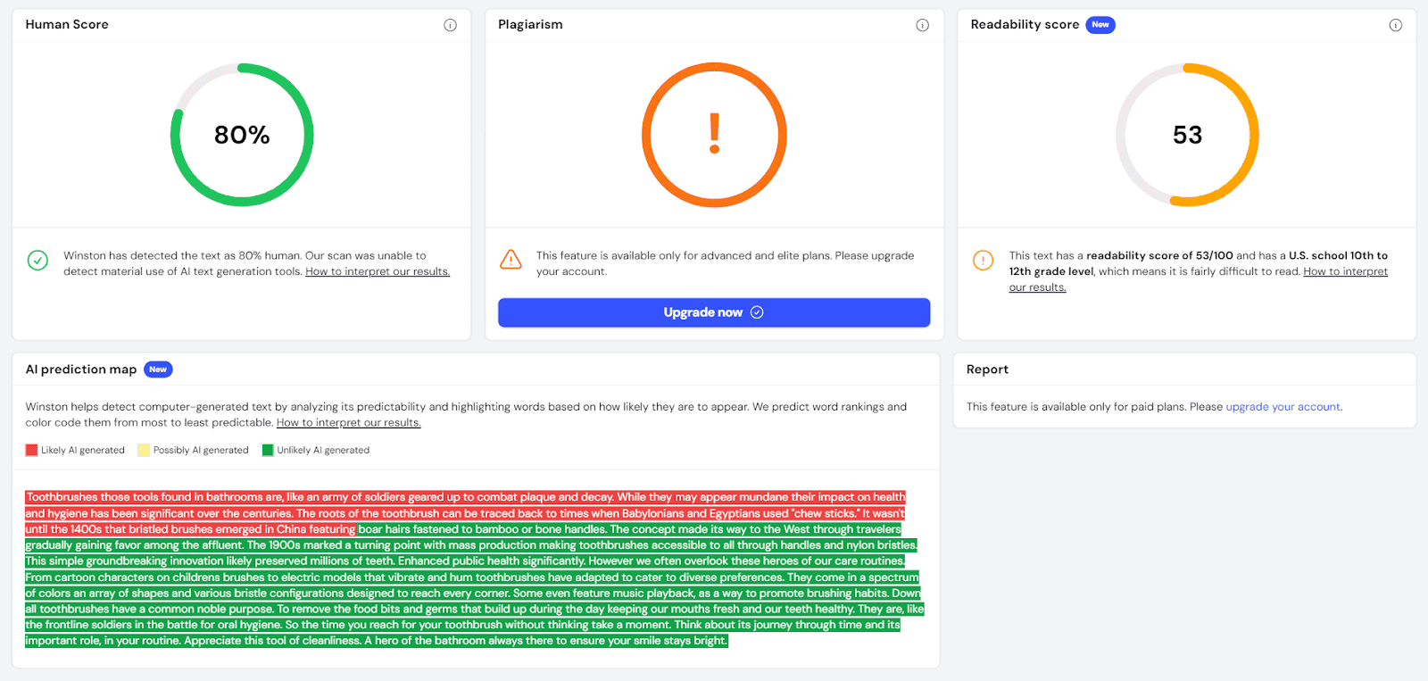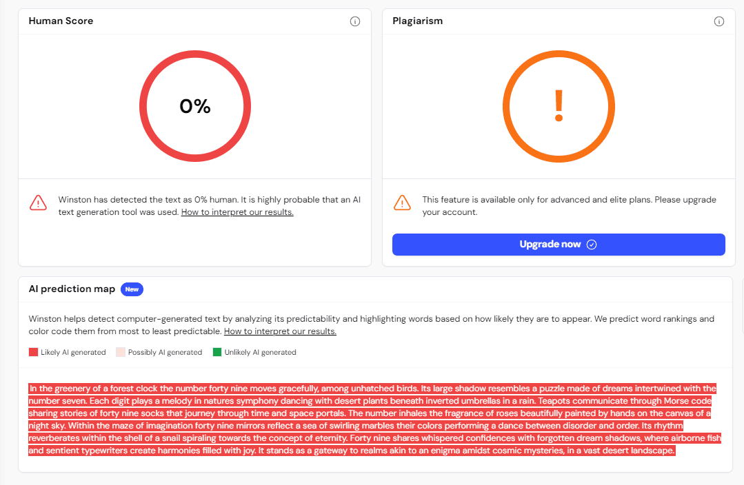 And lastly, we have Winston's AI Prediction Map. This nifty tool provides a color-coded visualization of your content, highlighting areas that sound synthetic or might trigger AI detectors. It's like having a heat map for AI fingerprints in your text.