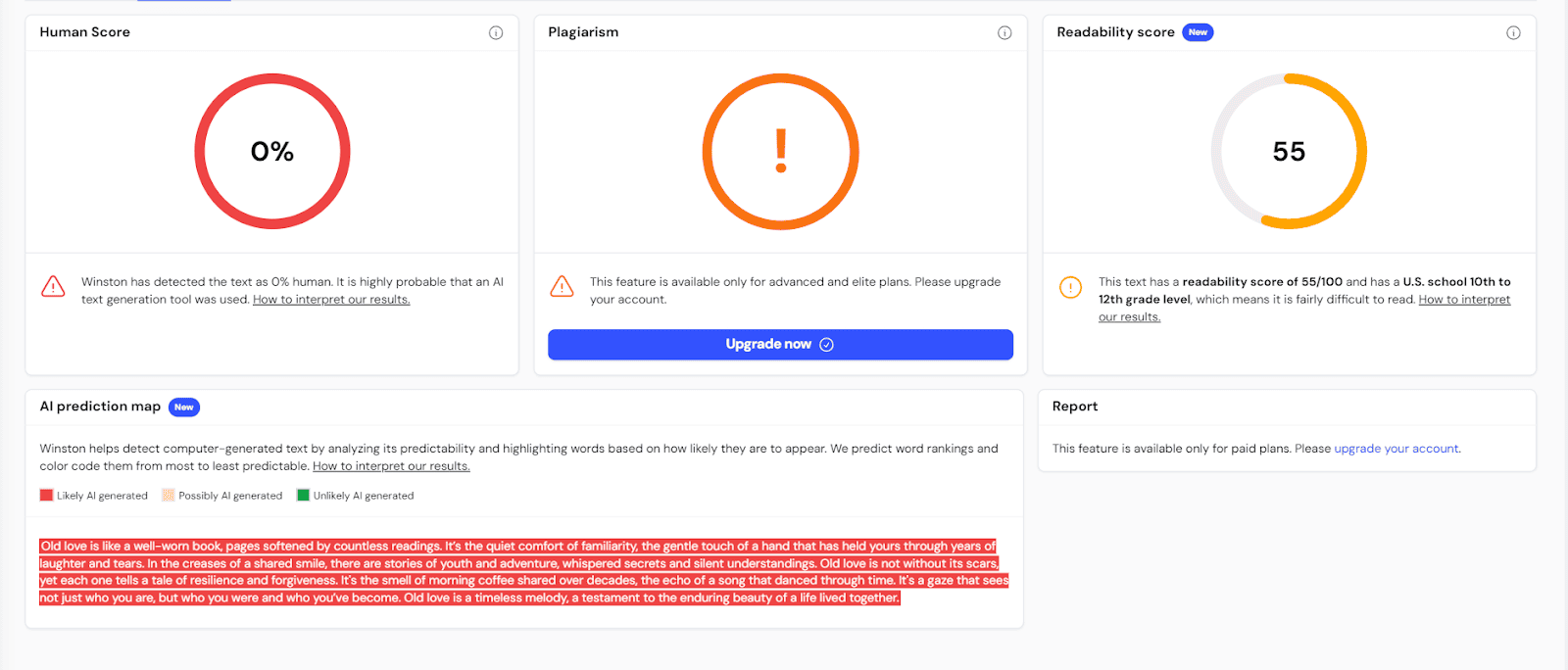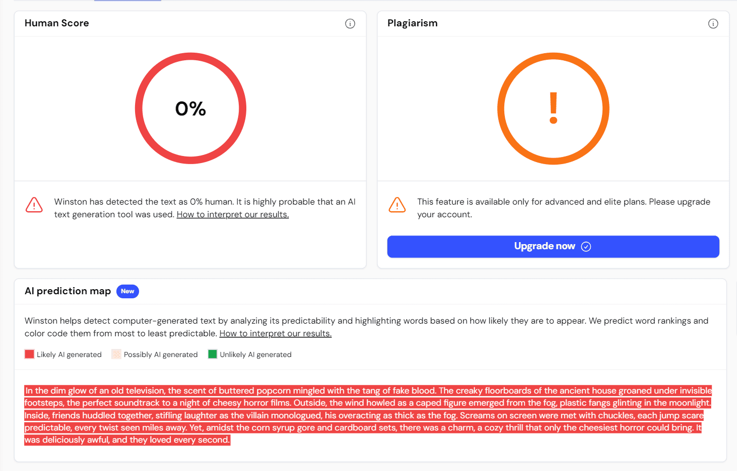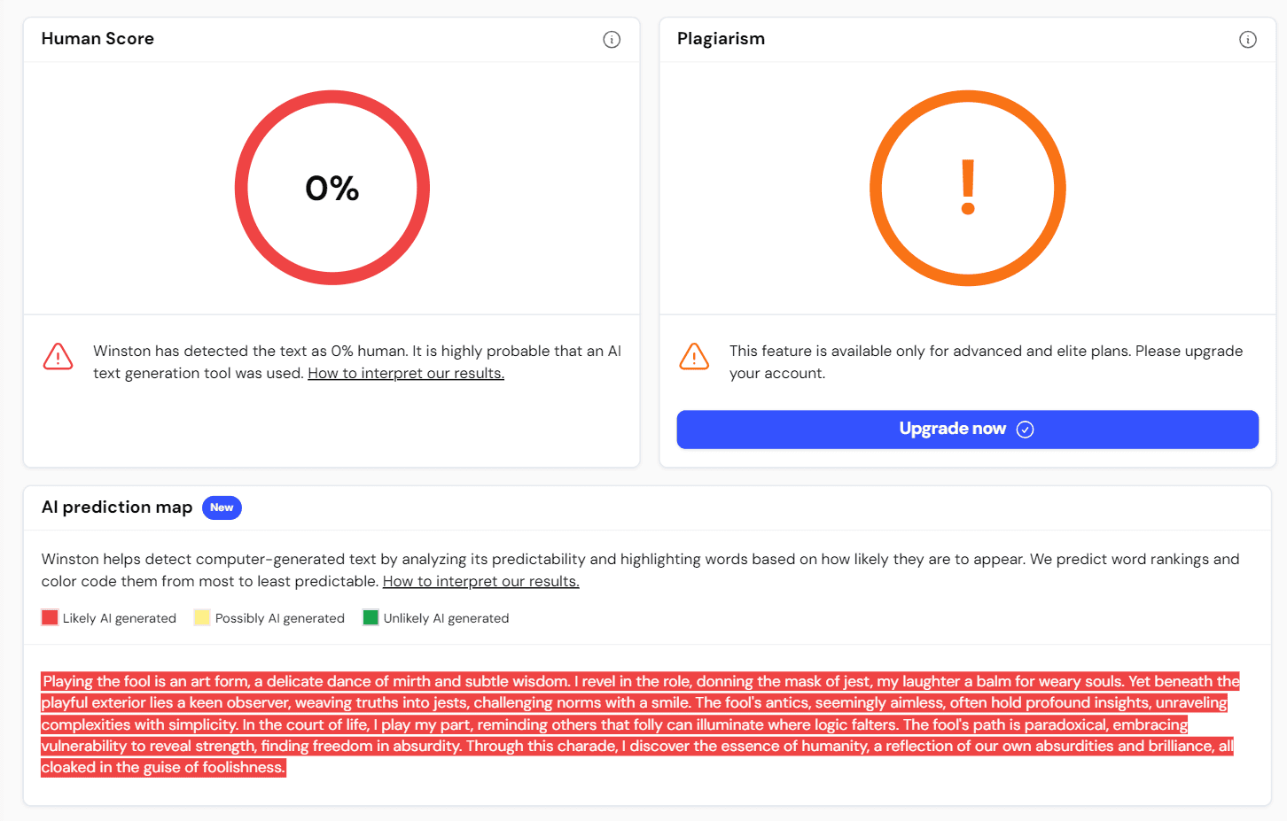 And lastly, we have Winston's AI Prediction Map. This nifty tool provides a color-coded visualization of your content, highlighting areas that sound synthetic or might trigger AI detectors. It's like having a heat map for AI fingerprints in your text.