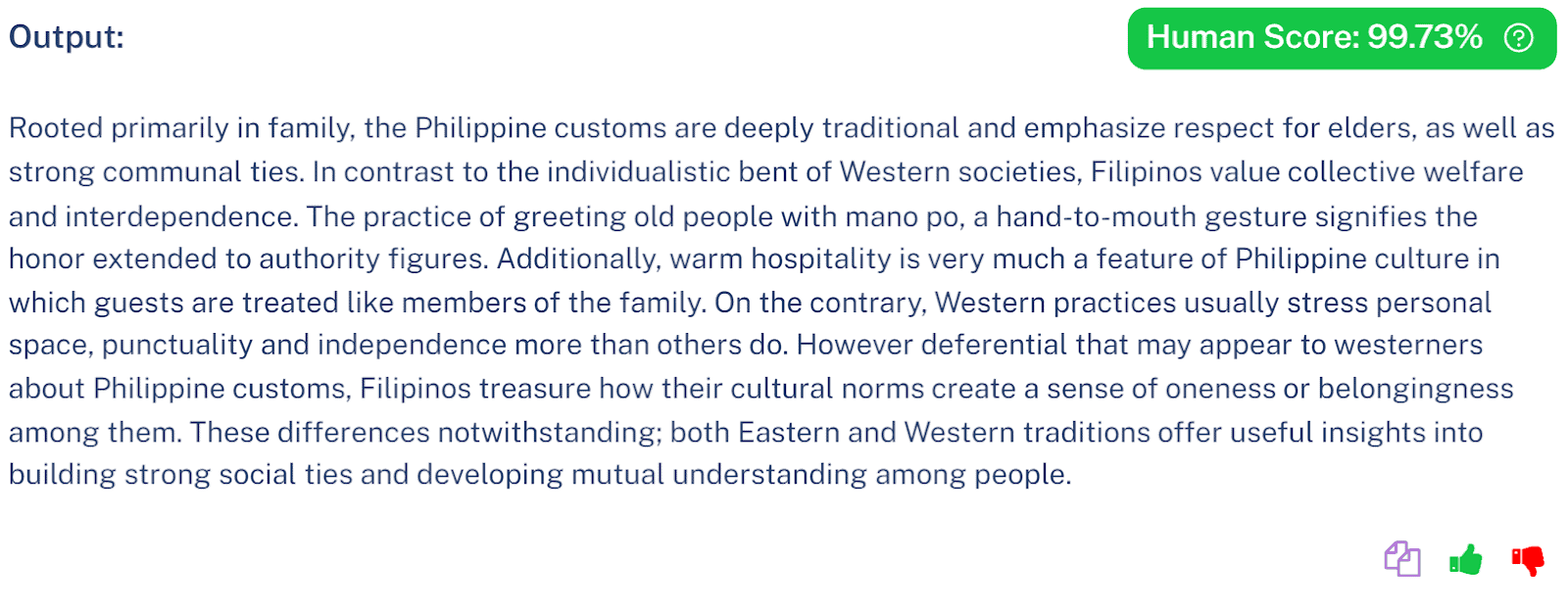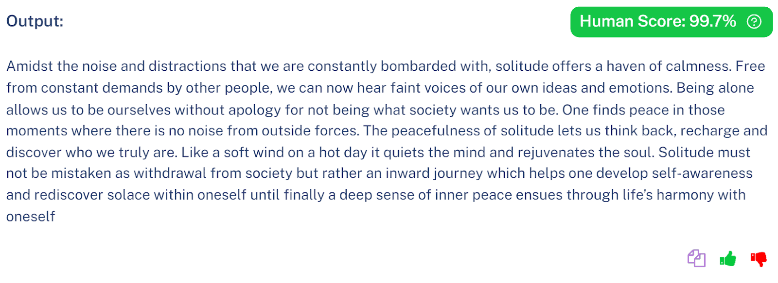 Just a quick note before we get started: each WriteHuman output comes with a human score at the top. Ignore this for now since we’re using a third-party detector instead called Sapling AI, one of the better performing detectors we tested for this article.