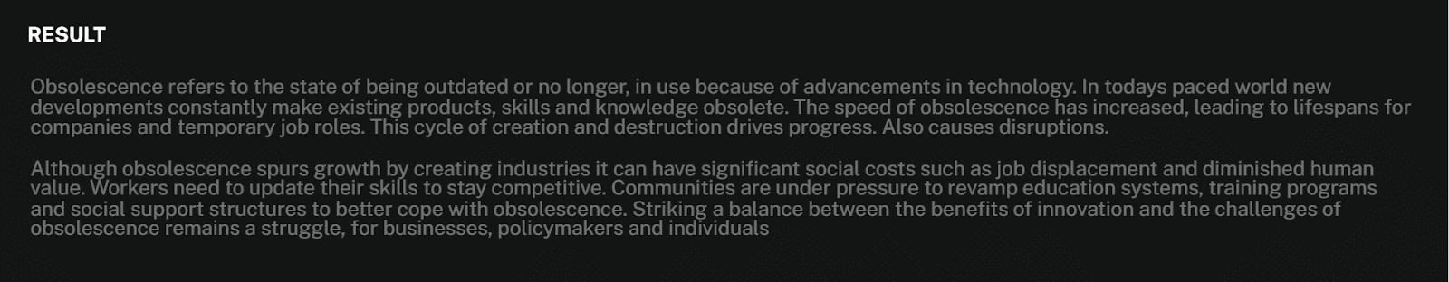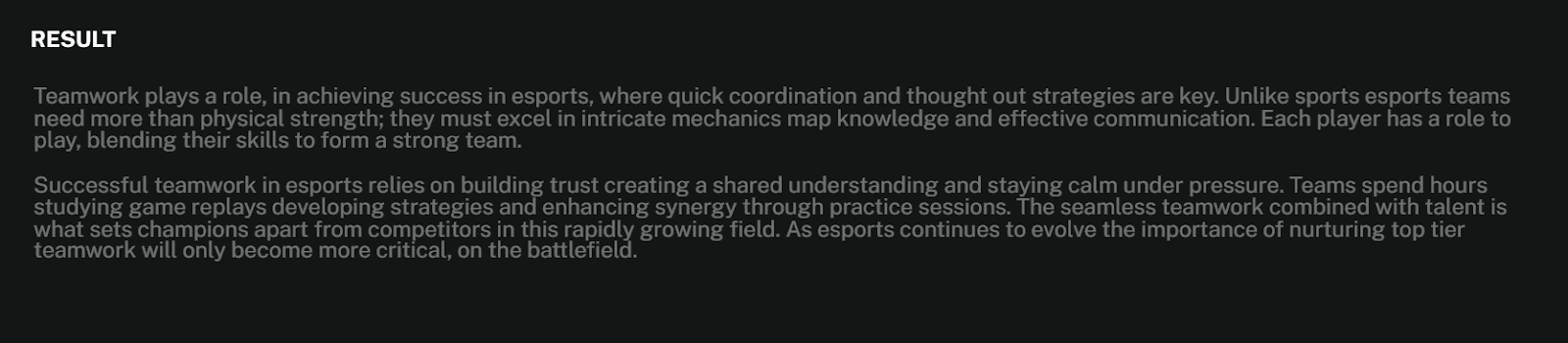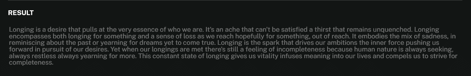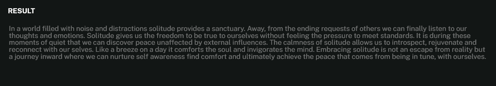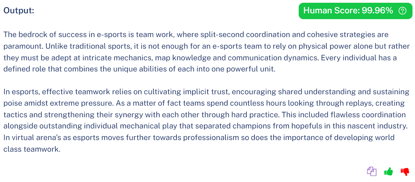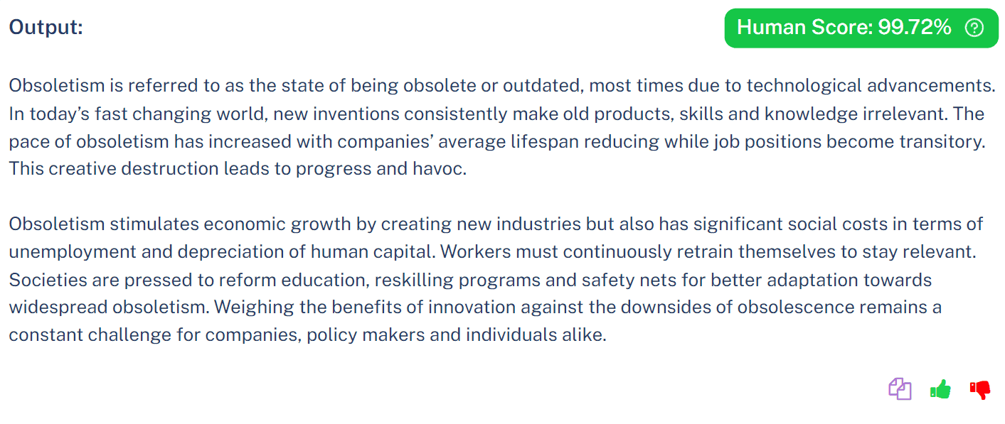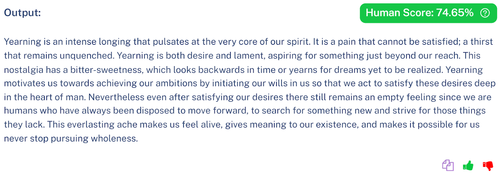 What’s surprising here is WriteHuman’s version of the AI text. It’s well-written, clear, and without any mistakes. There are still a couple of eyebrow-raising word choices (such as substituting “human supplies” for “human artists”) but it’s still night and day compared to Undetectable AI.